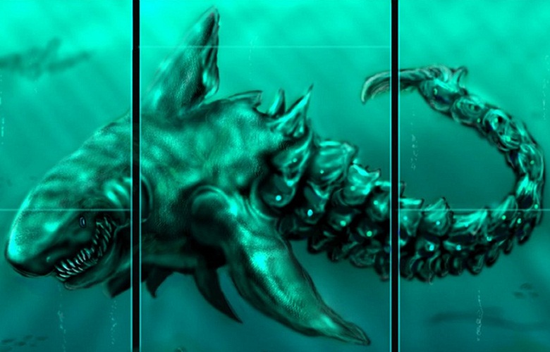 Before you know it, a mutated looking shark emerges from the water and starts swimming right towards you.